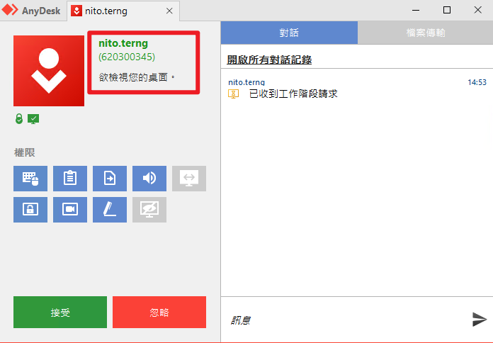 (為了確保電腦安全,請先確認連線的人是要協助您的IT同仁,再點選接受)