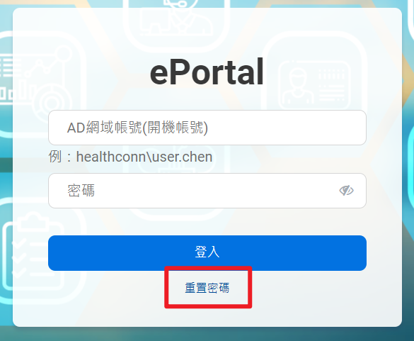 1. 連到ePortal員工入口網 https://eportal.healthconn.com,點選重置密碼